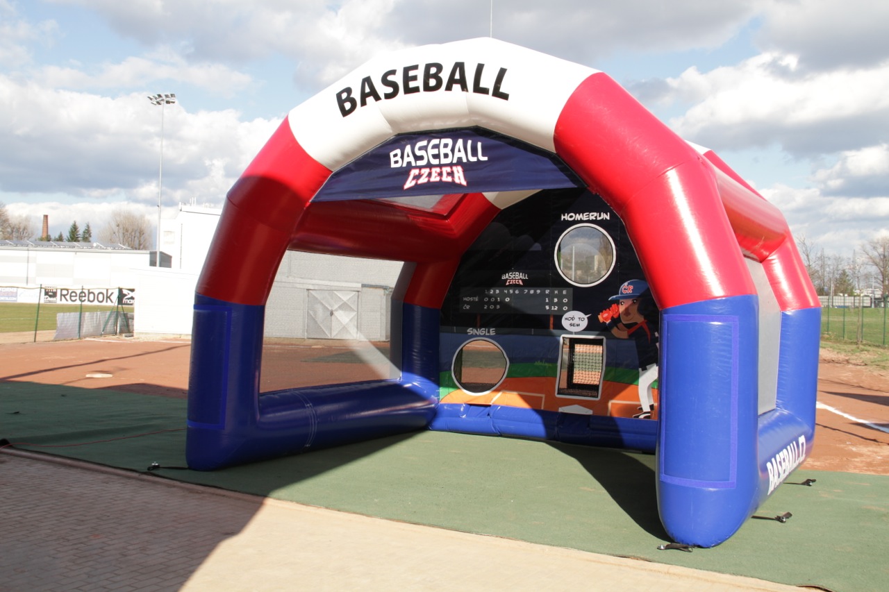 Mobilní nafukovací baseballová klec pro roadshow. Nadhoz do strikezóny, odpaly z T-čka, měkký míček, zadní plachta s potiskem a „otvory pro dobře mířené odpaly a nadhozy“. Atraktivní nafukovací atrakce vhodná pro open air promo akce. Na předních modrých stojkách suché zipy (60×120 cm) pro umístění výměnných transparentů. Instalace do 20 minut, doba nafouknutí po zapojení ventilátoru cca 1 min.