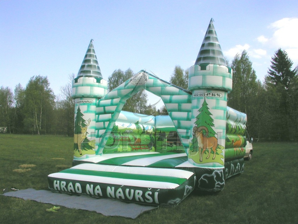 Střední skákací hrad s designem dle požadavků penzionu Na Návrší v Orlických horách. Design s lesní tématikou, lesními zvířátky a přesnou fotografií penzionu. Na předních věžích je kontakt na penzion a na bráně nadmořská výška.
