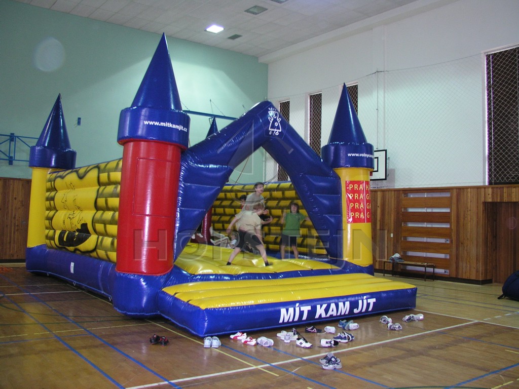 Velký skákací hrad s velice zajímavým designem a velkou kapacitou. Střídání výrazných barev, díky kterým je tento skákací hrad nepřehlédnutelný.