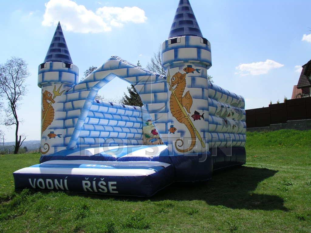 Střední skákací hrad. Bránu hradu stráží mořští koníci a v zadní části skákací plochy se prohání král moří Neptun se svým mořským spřežením. Velice vyhledávaný skákací hrad na koupaliště a kamkoliv k vodě.
