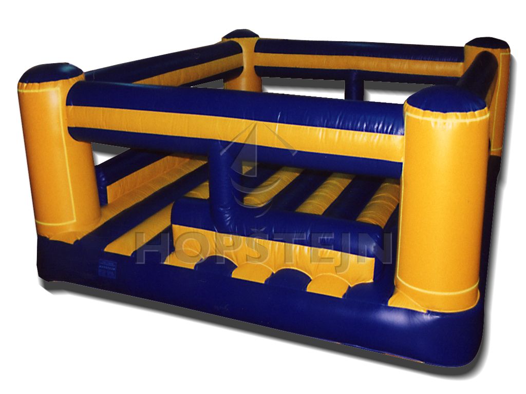Zápasnický ring s nafukovací podlahou zaručuje měkké přistání po obdrženém úderu. Zápasí se s pomocí molitanových kyjů, kdo se udrží na nohou, vyhrává! Design střídání barevných pruhů, transparenty na rohových valcích.