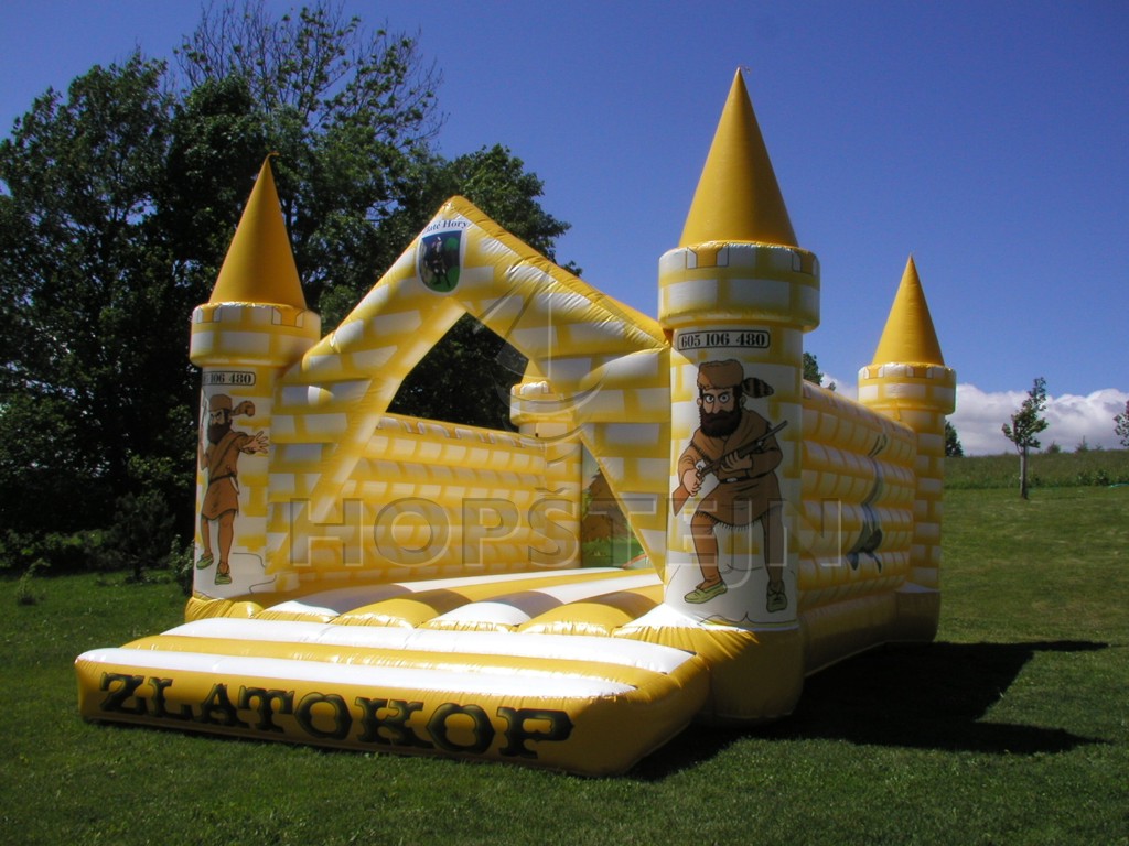Střední skákací hrad žlutě pískové až zlatavé barvy s dvěma zlatokopy na vstupních věžích, kteří tento hrad stráží jako oko v hlavě. V případě zájmu je možné design rozšířit, čí zcela změnit