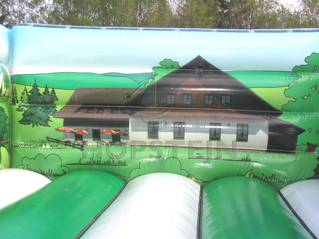 Střední skákací hrad s designem dle požadavků penzionu Na Návrší v Orlických horách. Design s lesní tématikou, lesními zvířátky a přesnou fotografií penzionu. Na předních věžích je kontakt na penzion a na bráně nadmořská výška.