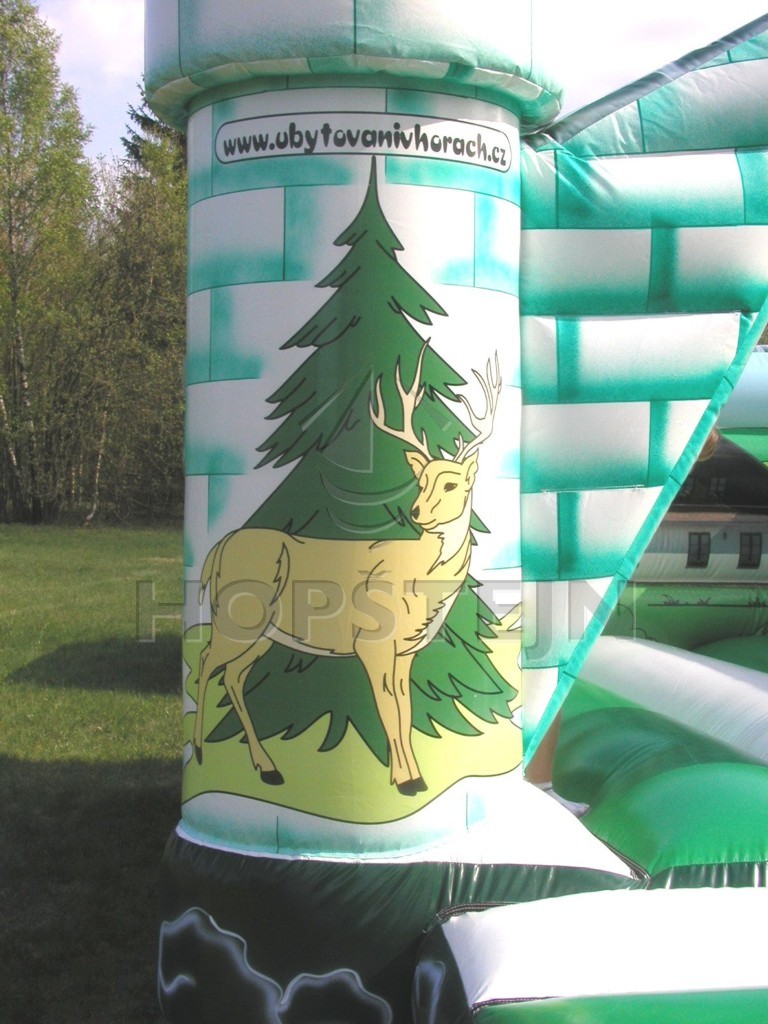 Střední skákací hrad s designem dle požadavků penzionu Na Návrší v Orlických horách. Design s lesní tématikou, lesními zvířátky a přesnou fotografií penzionu. Na předních věžích je kontakt na penzion a na bráně nadmořská výška.