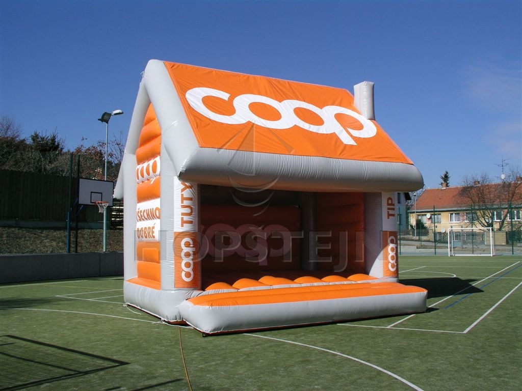 Skákací hrad originálních tvarů přímo podle požadavku společnosti COOP. Jedná se o skákací hrad ve tvaru rodinného domu s firemním potiskem. Střecha domu je odnímatelný transparent, který je možno měnit podle aktuální firemní akce či nabídky. Tuto atrakci je možné provozovat i bez „střechy“. Dále jsou na rozích domu 4ks transparentů s možností změn dle právě probíhající akce Vaší společnosti.