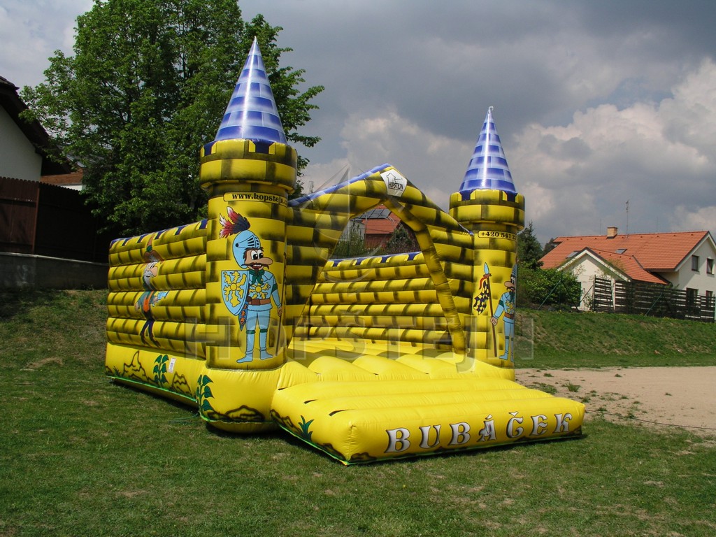 Střední hrad, design stříkací technikou, strašidelný hrad. Nejoblíbenější hrad na českém trhu. Vyztužení skákací plochy polyesterovými pásky, spoje hrad + věž technikou průběžného pásu.