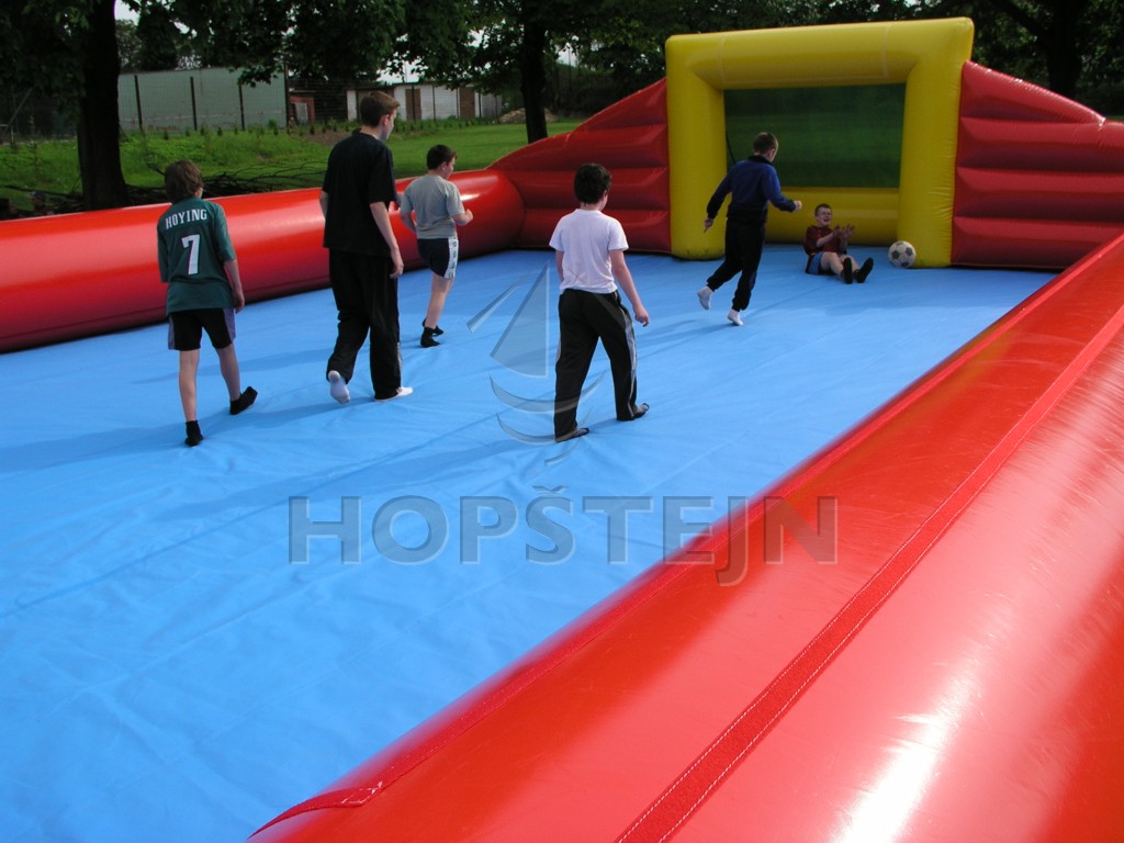 Nafukovací hřiště na fotbal, florbal, vodní fotbal a jiné aktivity. Nafukovací mantinely, brány, pevná PVC podlaha. Ideální atrakce na letní sezónu do kempů, na koupaliště… Velká barevná škála PVC plachtoviny. Suché zipy na hrazení pro Vaše transparenty.