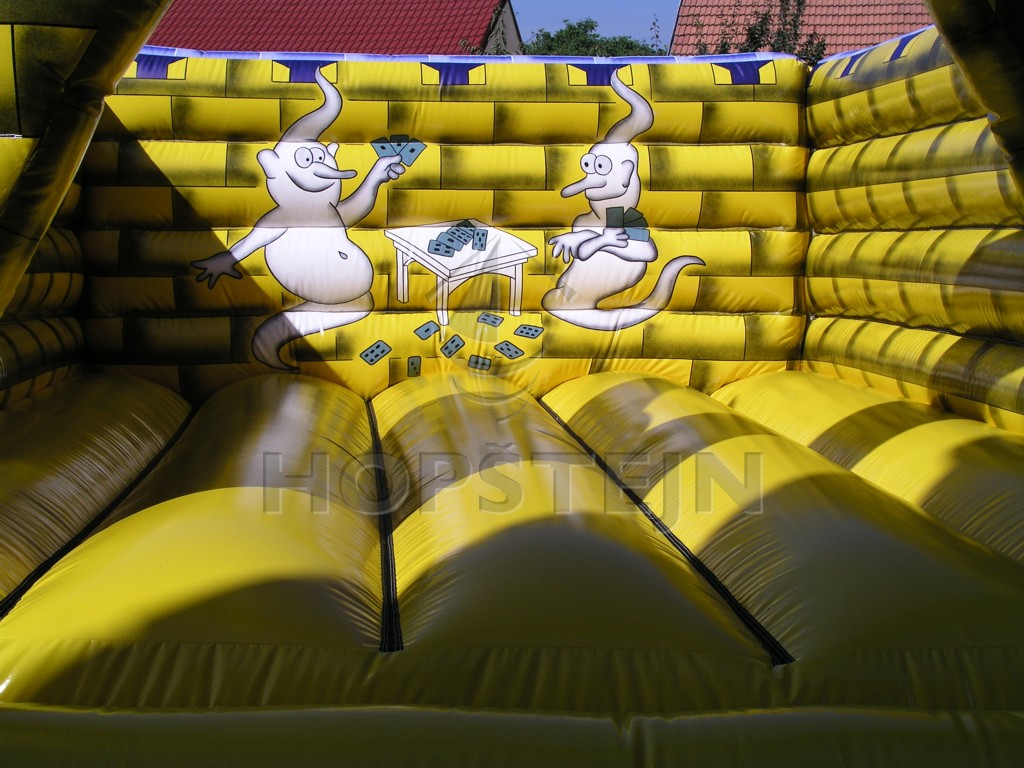 Střední skákací hrad, design stříkací technikou, strašidelný hrad, duchové hrající mariáš. Nejoblíbenější skákací hrad na českém trhu. Vyztužení skákací plochy polyesterovými pásky, spoje hrad + věž technikou průběžného pásu.