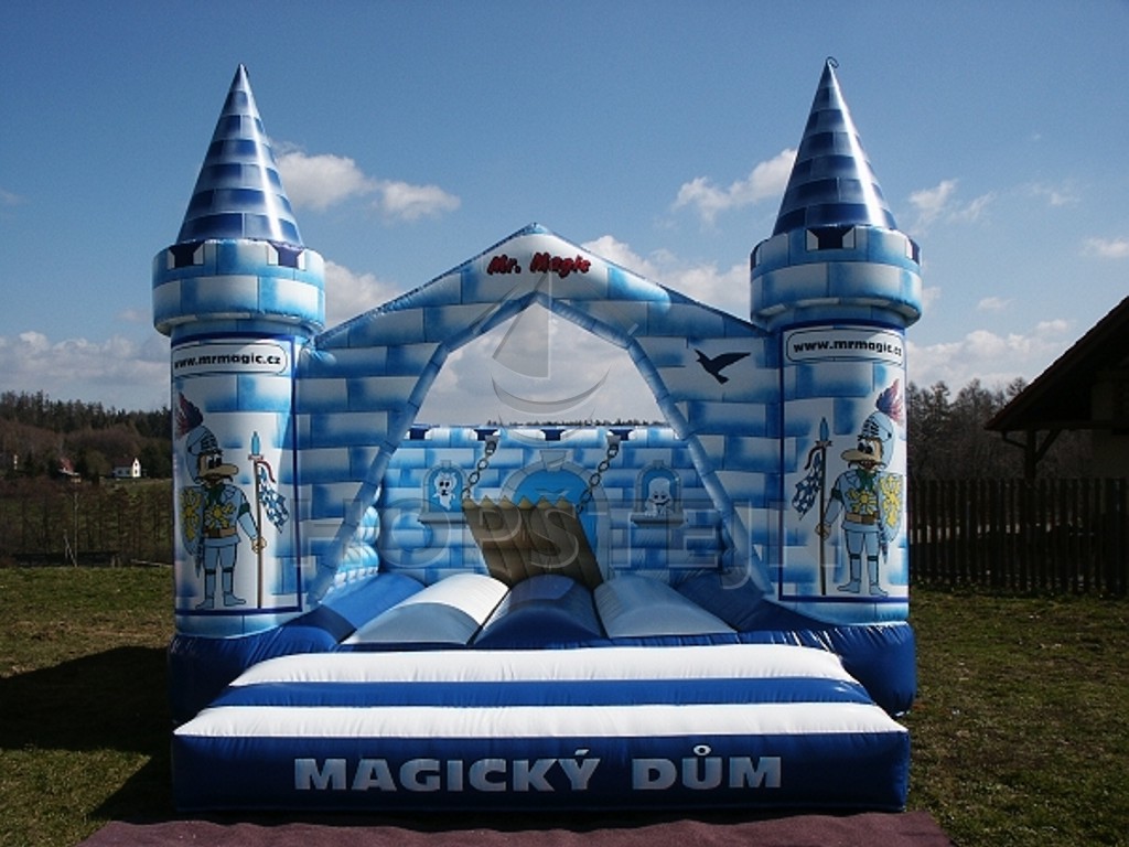Střední skákací hrad s rytíři, padacím mostem, duchy, webovým kontaktem na majitele. Na předních věžích je umístěn suchý zip, díky kterému můžete „pevný“ design překrýt reklamním transparentem dle Vašich potřeb.