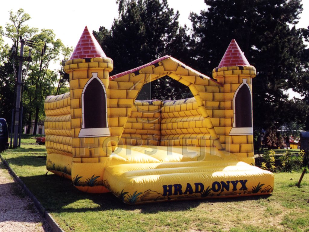 Velký skákací hrad. Velmi jednoduchého designu provedeného stříkací pistolí. Tento skákací hrad má velikou kapacitu skákajících dětí. Využívá jedné barvy PVC látky s kombinací červené látky na věžích