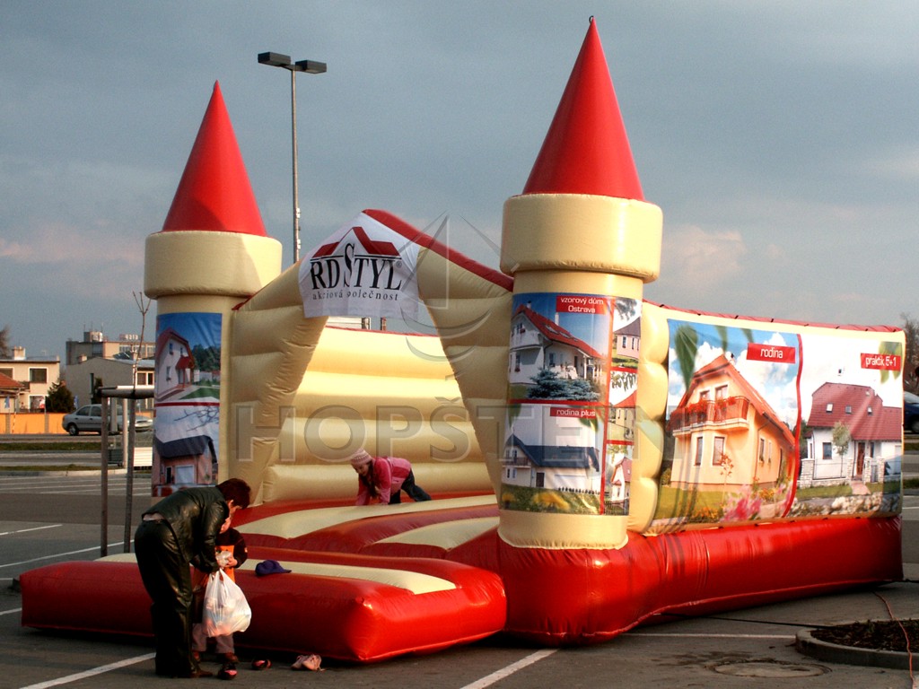 Střední skákací hrad, střídající dvě barvy se suchými zipy na které je možné umístit transparenty po všech stranách se vždy aktuálními informacemi o Vaší společnosti.