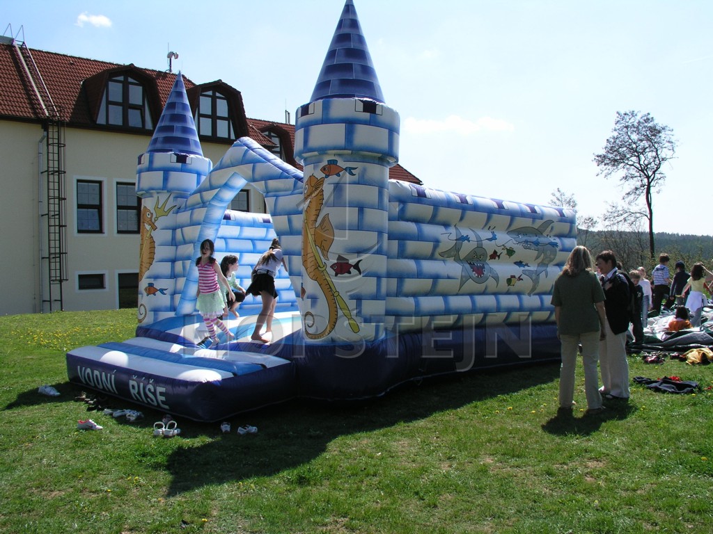 Střední skákací hrad. Bránu hradu stráží mořští koníci a v zadní části skákací plochy se prohání král moří Neptun se svým mořským spřežením. Velice vyhledávaný skákací hrad na koupaliště a kamkoliv k vodě.