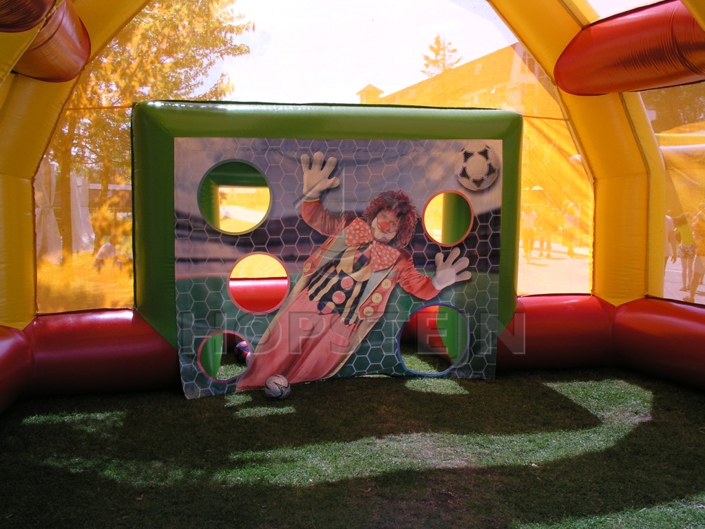 Mobilní nafukovací fotbalová branka. Lze využít jako klasickou fotbalovou bránu, bránu opatřenenou plachtou s potiskem a „otvory pro dobře mířené penalty“, plachtu se suchým zipem – trefování míčky na cíl, případně využití jako mobilního pódia. Atraktivní nafukovací atrakce vhodná pro open air promo akce. Při výrobě lze použít různých barevných kombinací, velikostí, bránu lze zmenšit o první oblouk, atd. Rychlost instalace (do 10 minut), možností osazení suchými zipy pro výměnné transparenty.
