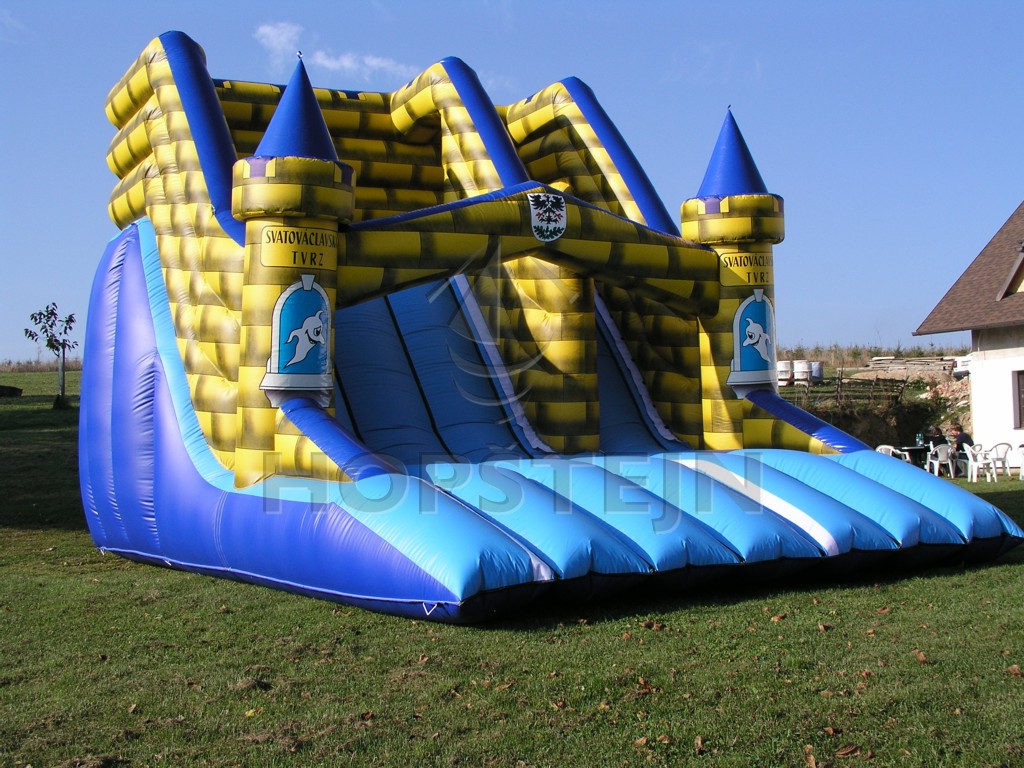 Základní velikost skluzavky. Provazovým žebříkem nahoru, 2,5 metrové převýšení, dojezd 1,5 m. Design v tradičním oblíbeném stylu naší firmy. Možnost libovolné barevné kombinace dle Vašeho přání.