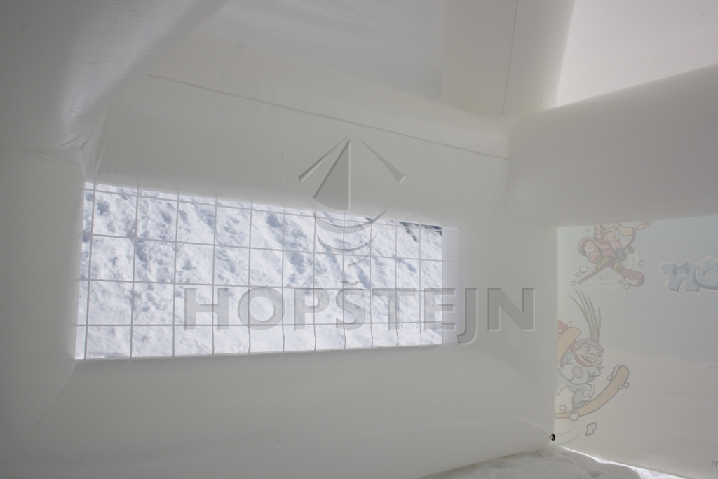 Reklamní nafukovací stánek sloužící jako zázemí pro učitele lyžařské školy. Možno využít i jako stánek pro catering, výstavnictví, použití na krátkodobých reklamních akcích, sportovních akcích – zázemí pro pořadatele atd. Stěny jsou vyrobeny jako reklamní transparenty s logem společnosti.