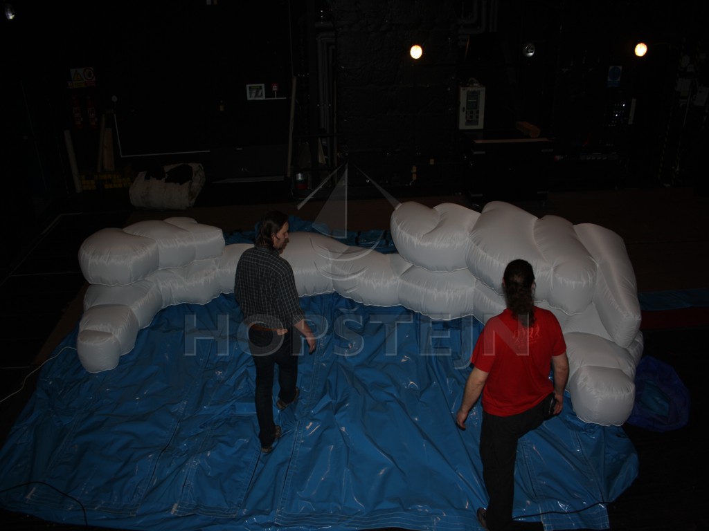Nafukovací skluzavka sloužící jako část divadelní dekorace pro Městské divadlo v Brně ve hře Ptákoviny podle Aristofana. Herci se v rámci divadelní hry spouštějí po skluzavce k zemi z nebes, která jsou taktéž nafukovací. Fotografie z představení poskytlo Městské divadlo v Brně.