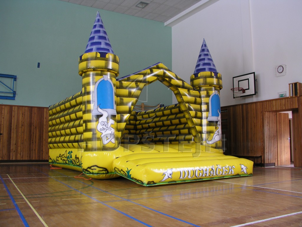 Střední skákací hrad, design stříkací technikou, strašidelný hrad, duchové hrající mariáš. Nejoblíbenější skákací hrad na českém trhu. Vyztužení skákací plochy polyesterovými pásky, spoje hrad + věž technikou průběžného pásu.