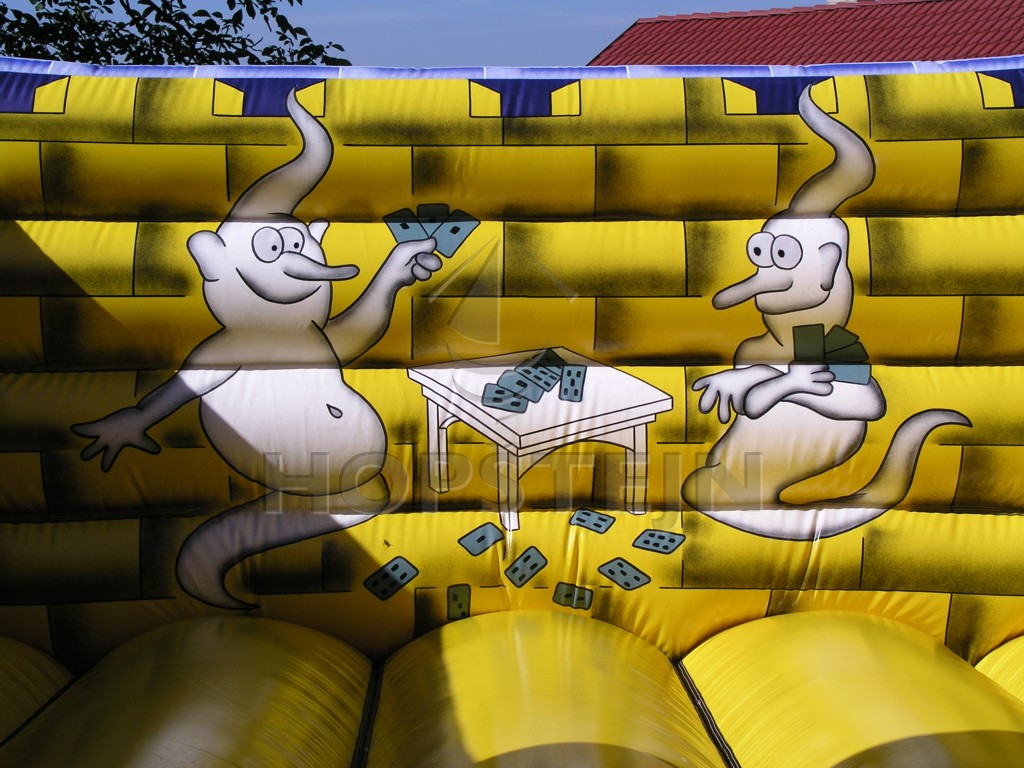 Střední skákací hrad, design stříkací technikou, strašidelný hrad, duchové hrající mariáš. Nejoblíbenější skákací hrad na českém trhu. Vyztužení skákací plochy polyesterovými pásky, spoje hrad + věž technikou průběžného pásu.
