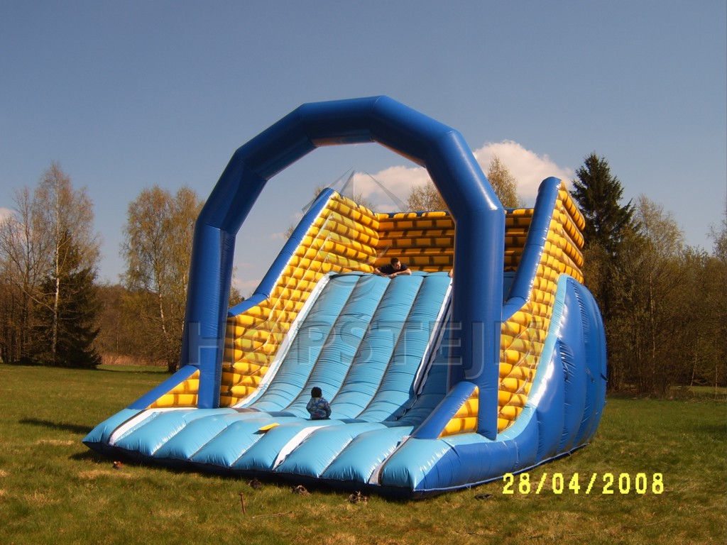 Nezvyklá velikost a základní tvar skluzavky. Po „schodech“ z tvrzeného molitanu nahoru, 3 metrové převýšení a dojezd 1,5 m. Design v tradičním oblíbeném stylu naší firmy, který je možné upravit dle Vašich potřeb a požadavků.