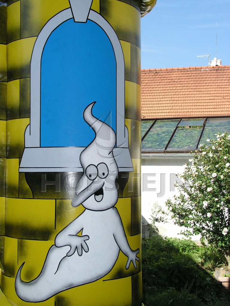 Střední skákací hrad, design stříkací technikou, strašidelný hrad, duchové hrající mariáš. Nejoblíbenější skákací hrad na českém trhu. Vyztužení skákací plochy polyesterovými pásky, spoje hrad + věž technikou průběžného pásu.